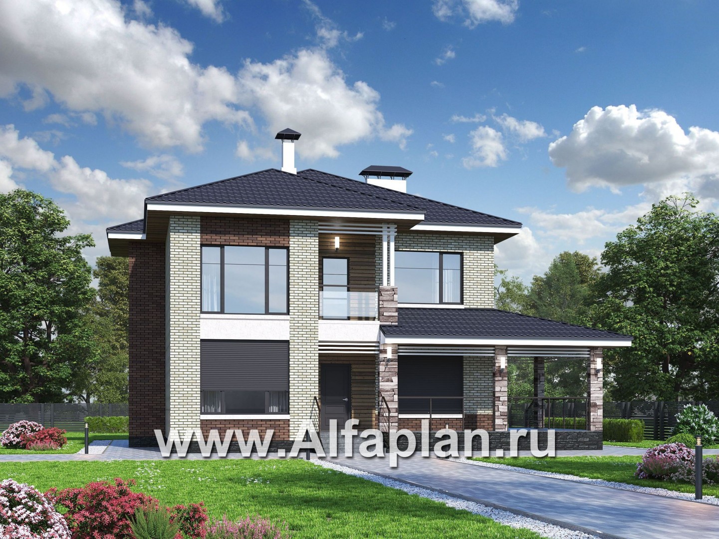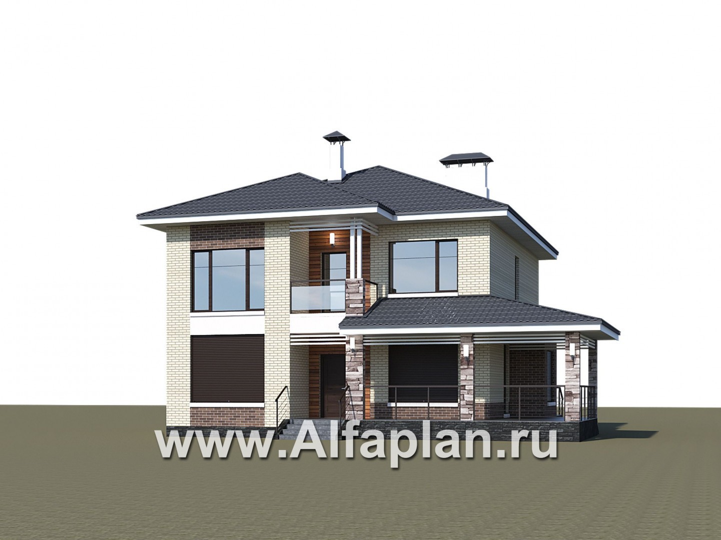 695A-R-S «Роман с камнем» — проект двухэтажного дома, с террасой, со скрытой установкой ролет на окнах 1-го этажа