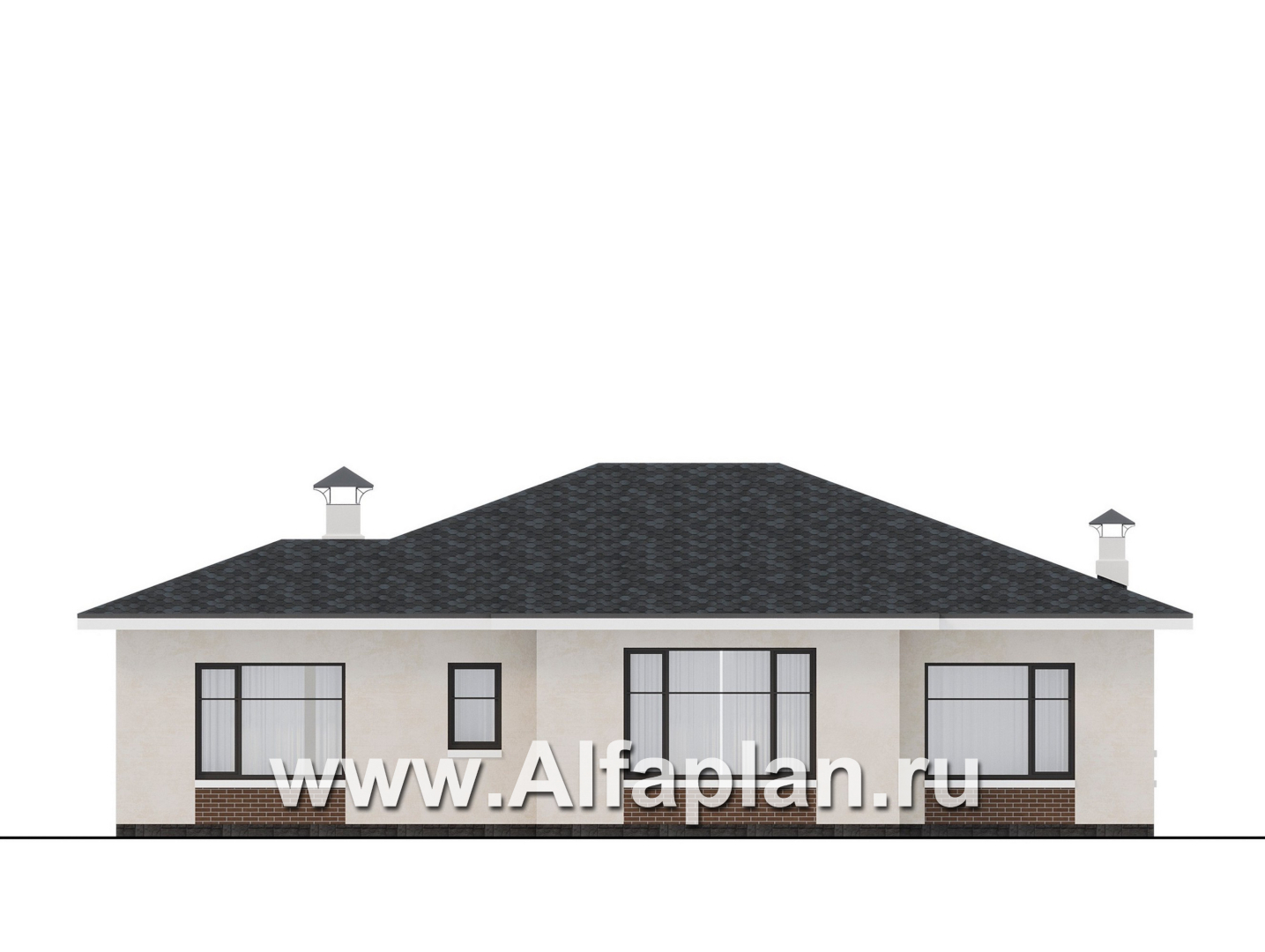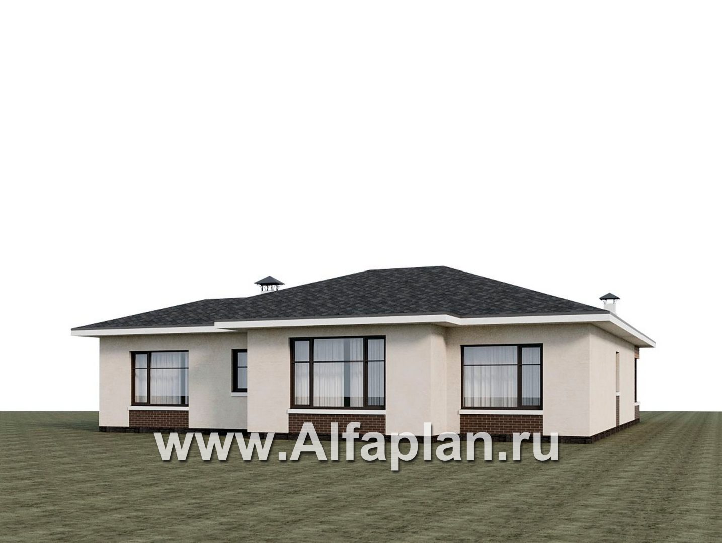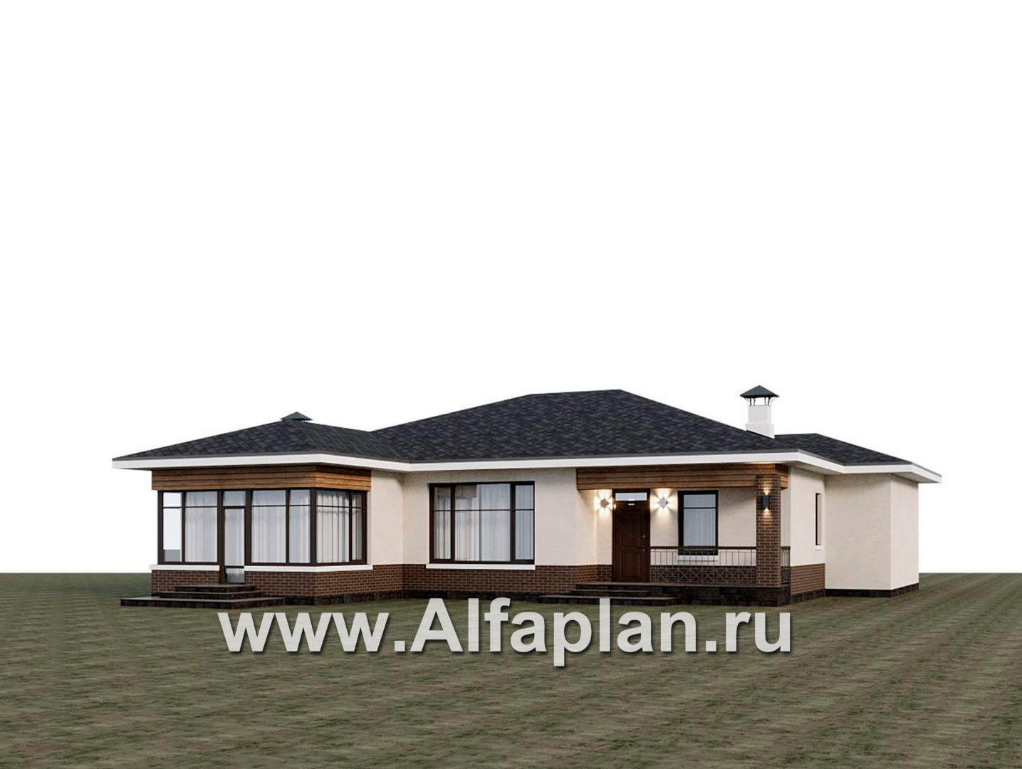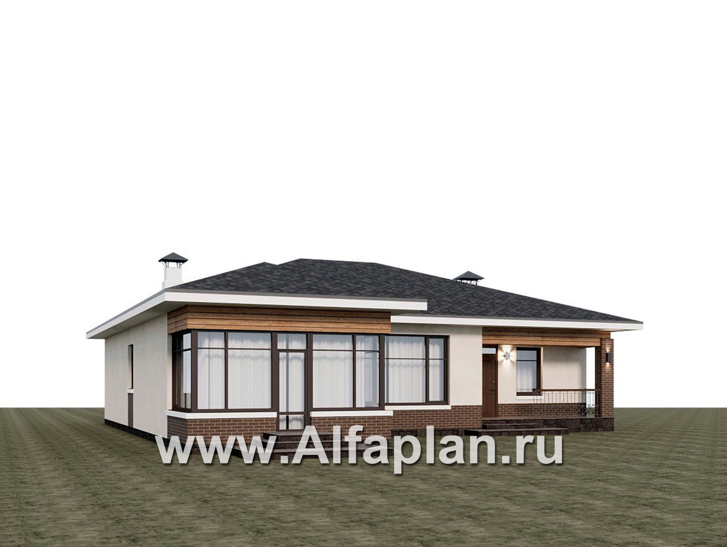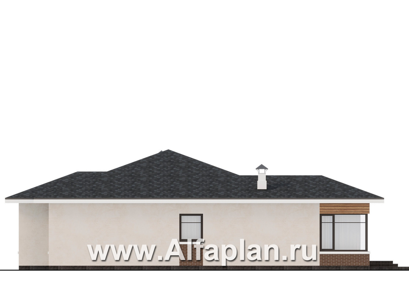 Фасад современного одноэтажного дома 610А «Эрато» запоминается портиком террасы на главном фасаде, и красиво оформленным входом в дом. Традиционно для Альфаплан, облицовка стен, на террасе и возле крыльца, выполнена деревянной вагонкой. Фасады выполнены в отделочном кирпиче.