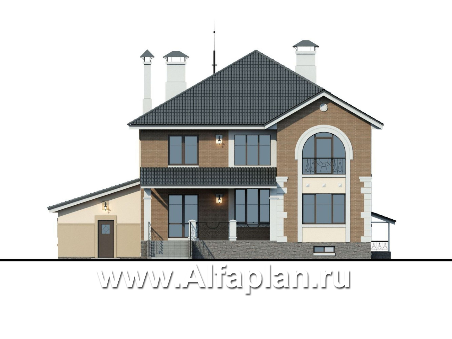 137BC «Феникс» - проект двухэтажного дома, с эркером и с террасой, планировка с гаражом на 2 авто и с цокольным этажом