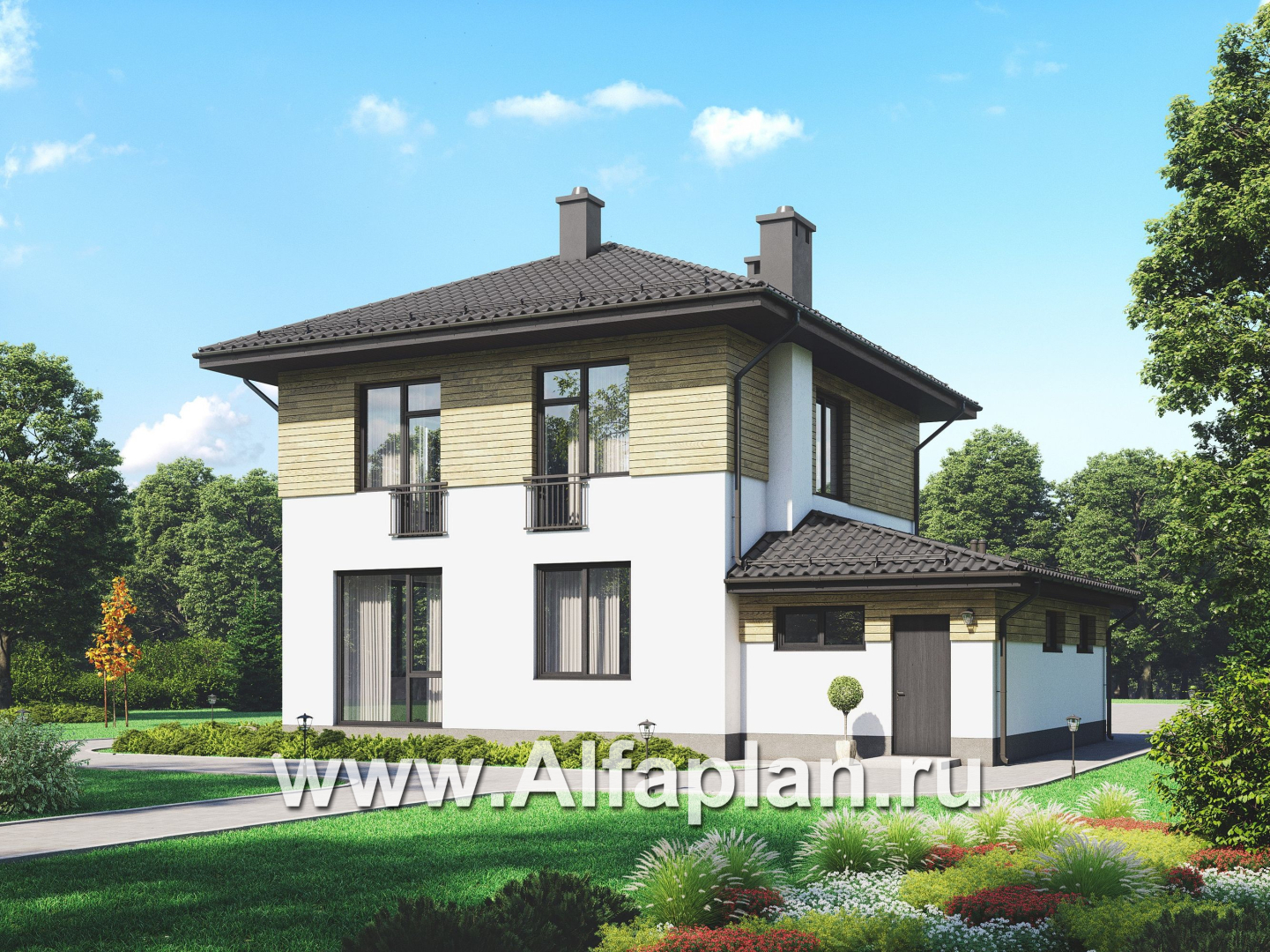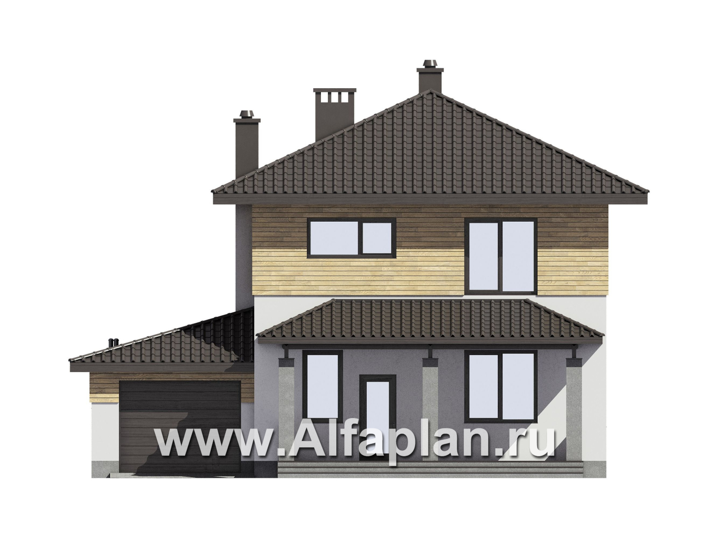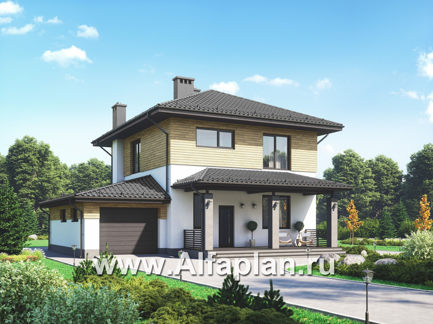 Проект двухэтажного дома, с террасой и с гаражом, планировка с кабинетом на 1 эт