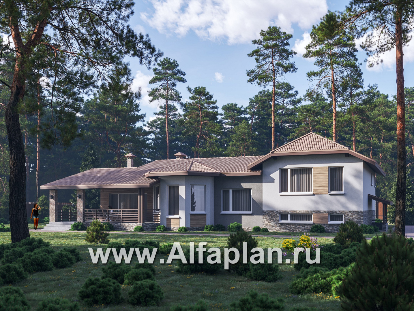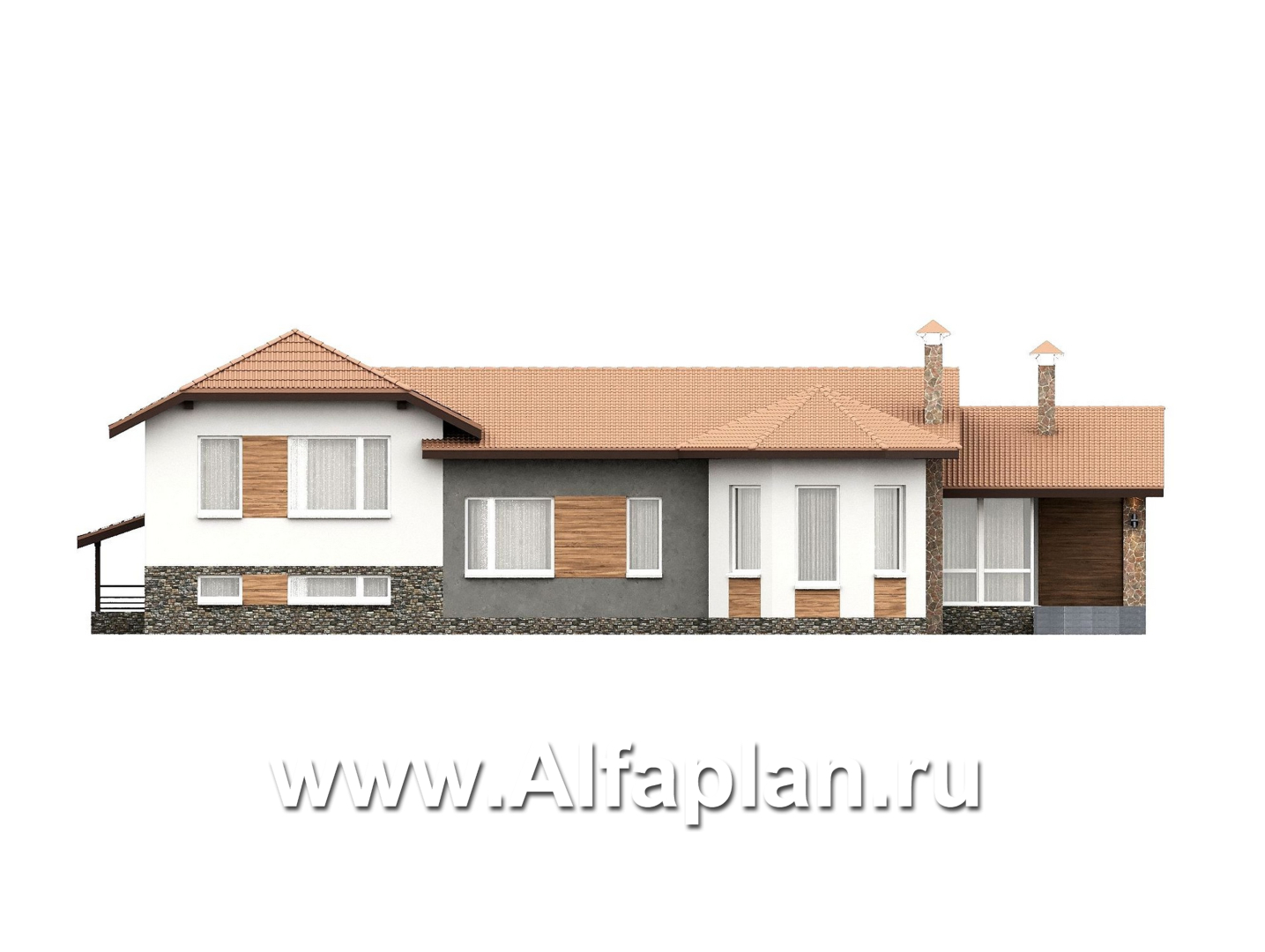 Этот коттедж внешне выглядит довольно небольшим, но внутри имеется почти 300 кв. м. площади, причем третья часть от общей территории – жилые комнаты. Образ одноэтажного здания обманчив: по проекту здесь размещается целых три этажа (включая мансарду и цоколь). Игра шоколадных оттенков облицовочных материалов и кровли выгодно подчеркивается массивными колоннами возле крыльца и декором из крупного камня.