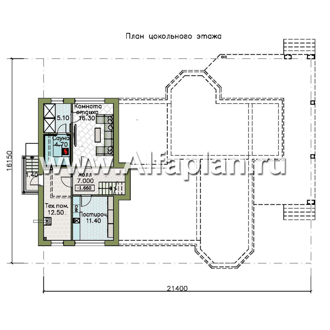 Этот проект коттеджа предусматривает наличие цокольного этажа, который занимает лишь правое крыло здания. Здесь располагается холл, большая постирочная, кладовка, туалет, техническое помещение (имеется отдельный вход с улицы), комната отдыха и санузел (с ванной, душевой кабиной и мини-сауной).