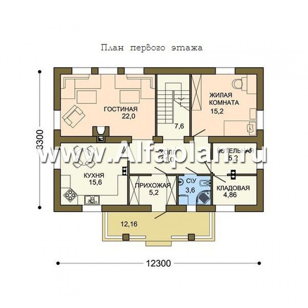 Большое крыльцо с навесом ведет в небольшую прихожую, а затем в холл, справа от которого расположен санузел, котельная, кладовая и одна достаточно просторная жилая комната. В ней при необходимости можно организовать спальню для пожилых родителей (на первом этаже им будет удобней жить), дополнительную спальню для одного из членов семьи или комнату для гостей.
