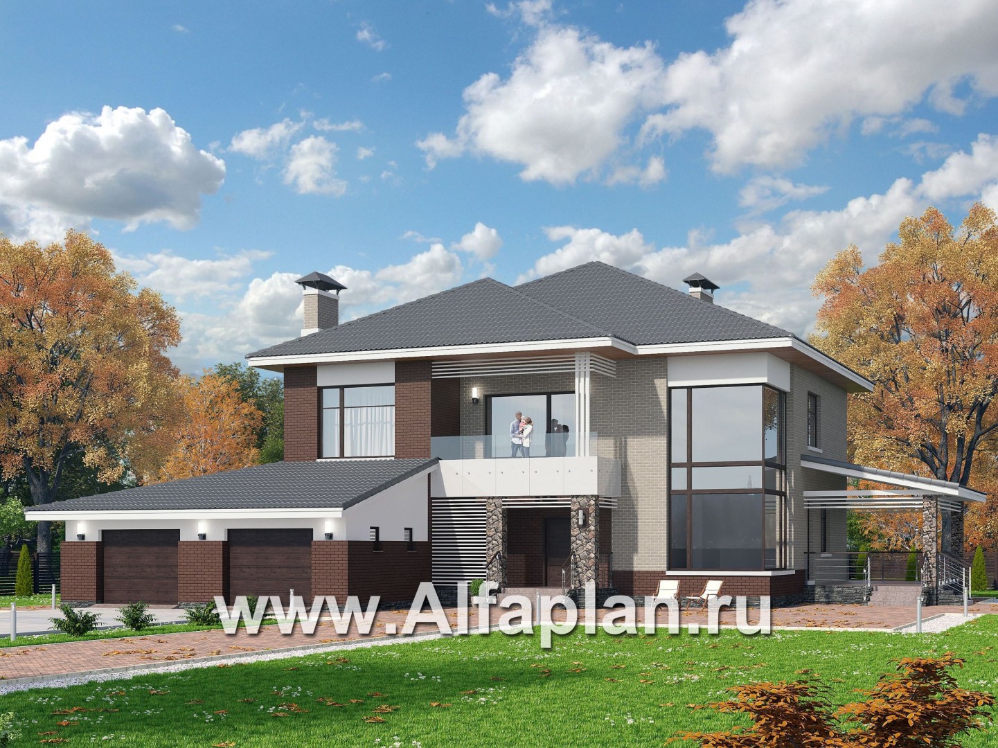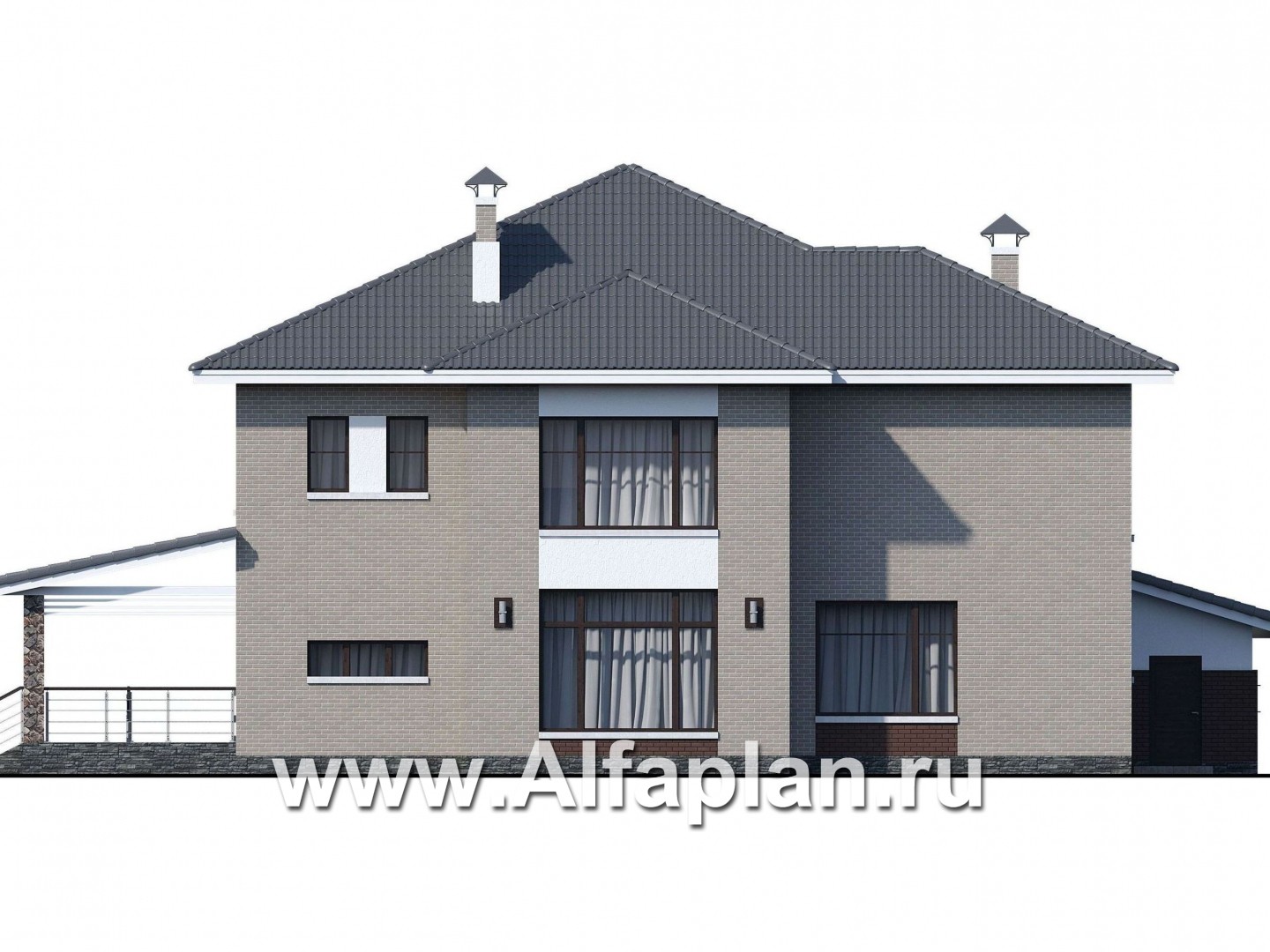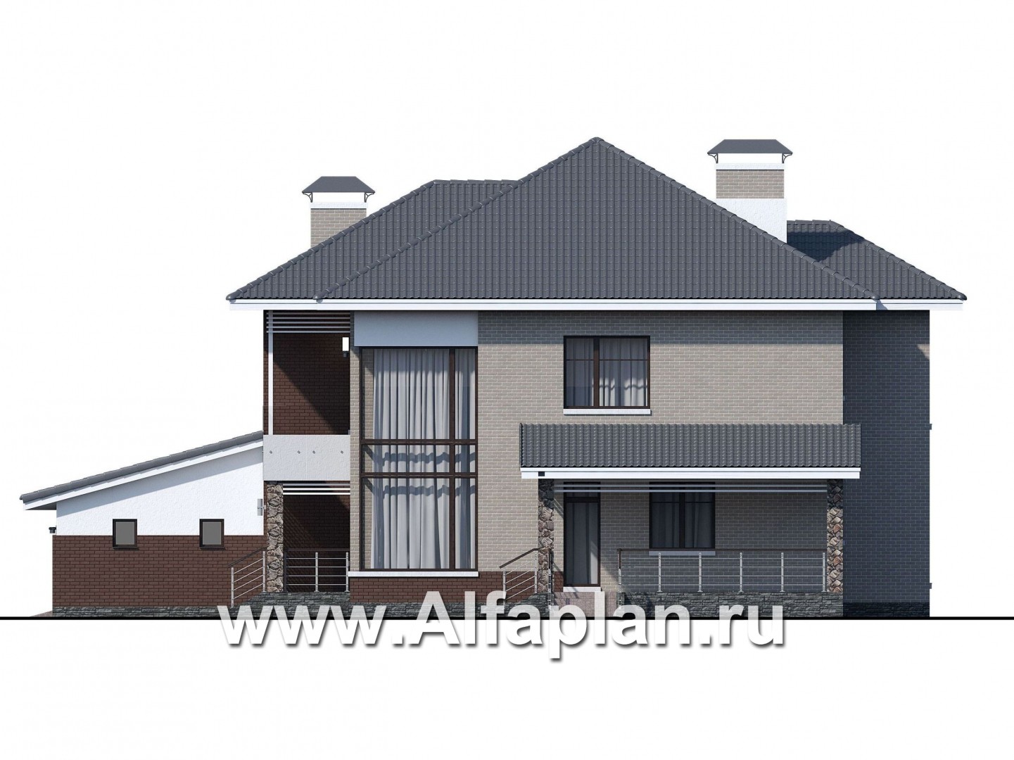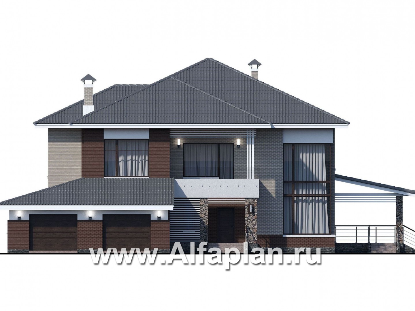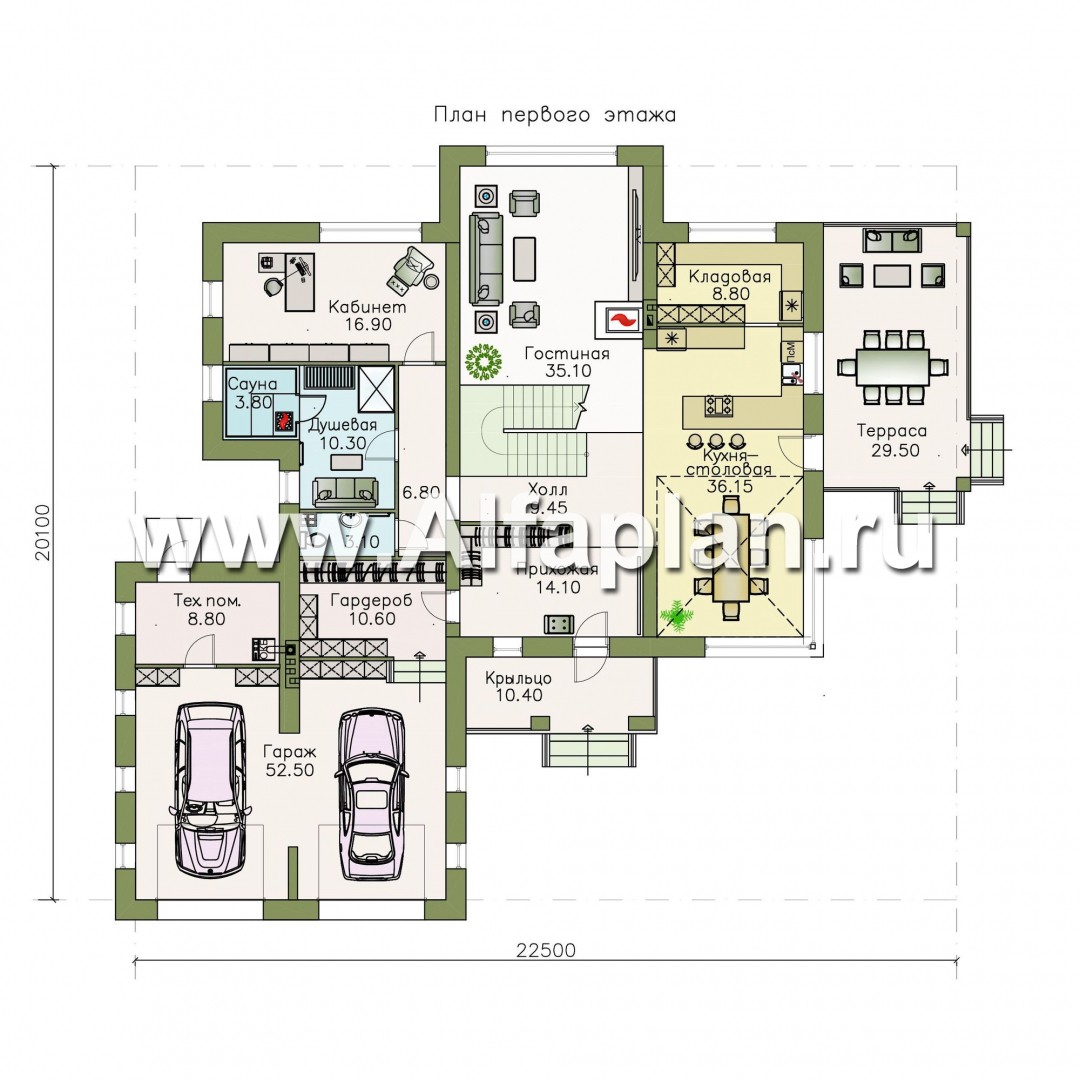 «Луара» — проект двухэтажного дома, планировка с двусветной столовой, с сауной и с террасой, гараж на 2 авто