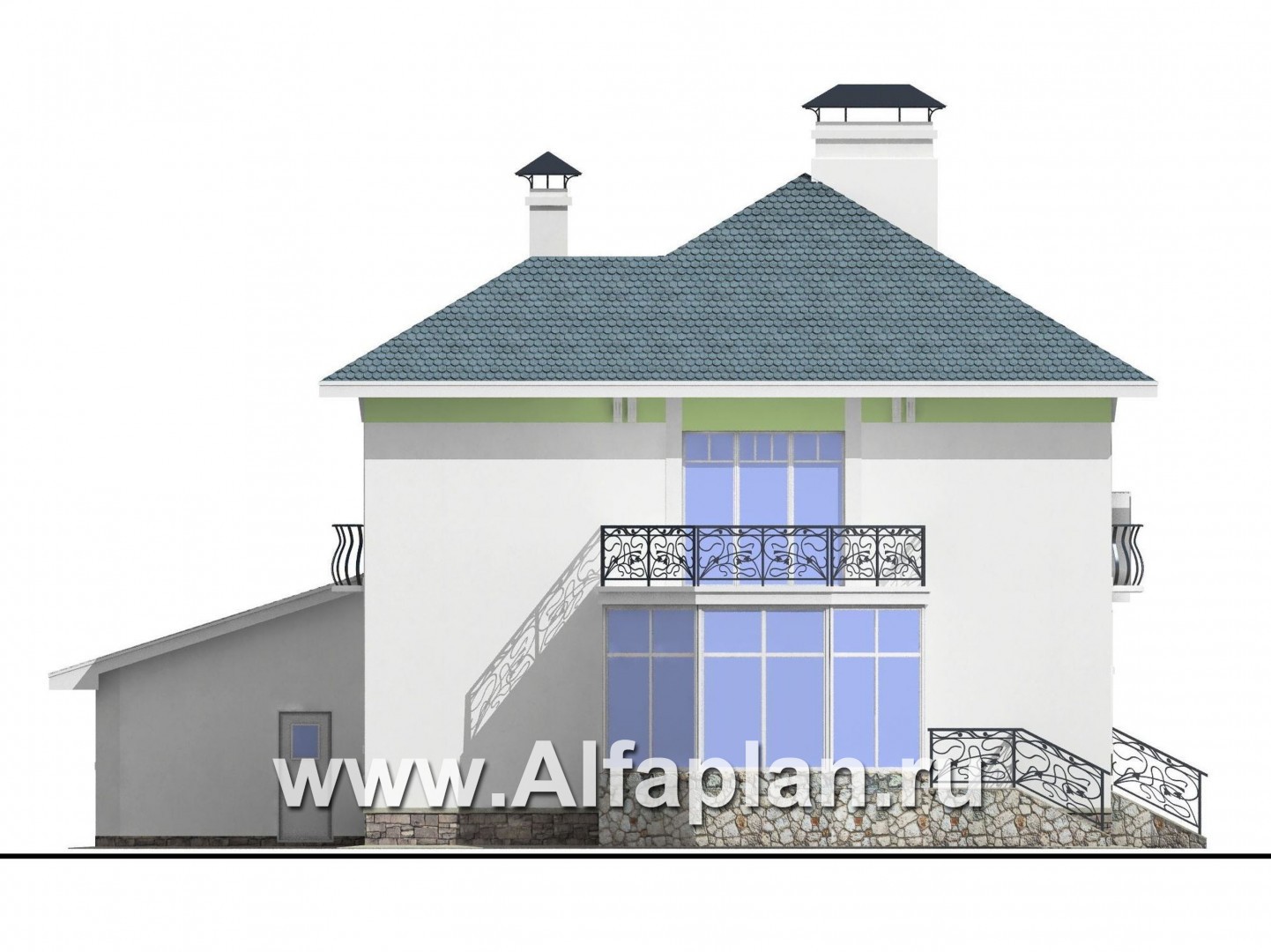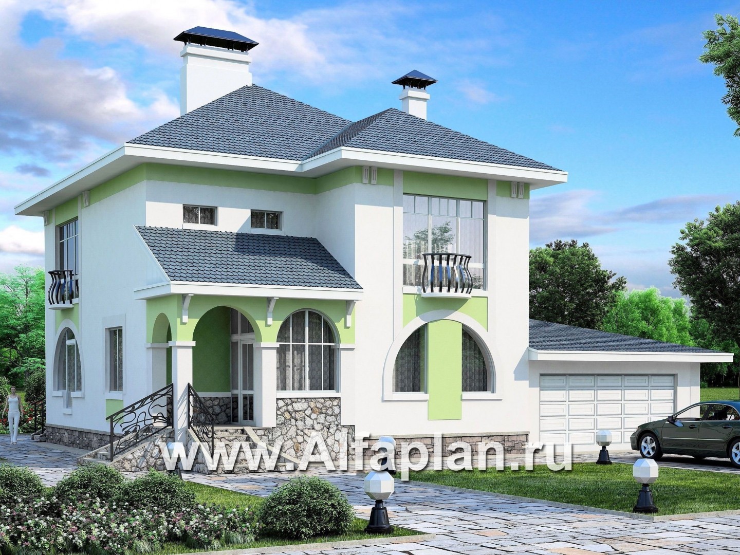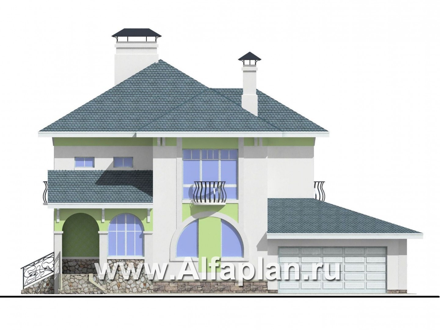 Отличительная черта особняка 76А 3D «Палома» — создание максимального комфорта для проживающих в нем минимальными средствами. В отделке фасадов мы видим идеальное сочетание белоснежного цвета оштукатуренных стен, цоколя из декоративного камня и серой битумной черепицы, полностью отвечающее классическому замыслу архитектора.