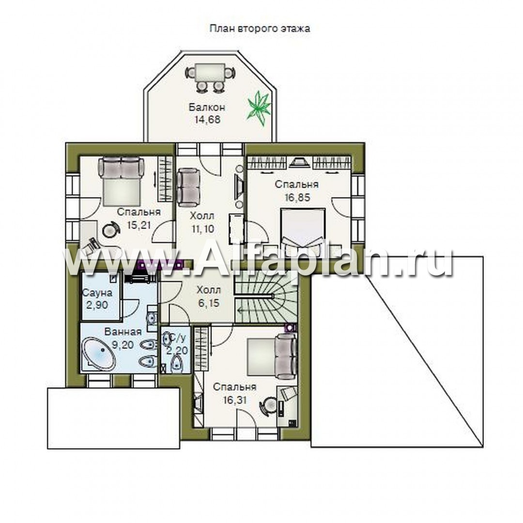 На втором этаже оборудована полноценная зона отдыха. Ванная с компактной сауной и санузлом находится по центру и удобна для использования всеми обитателями дома. Три отдельных уютных спальни со встроенными платяными шкафами выходят в холл. Большой балкон расположен прямо над верандой. Он даст возможность трапезничать на воздухе и отдыхать, принимая воздушные ванны.
