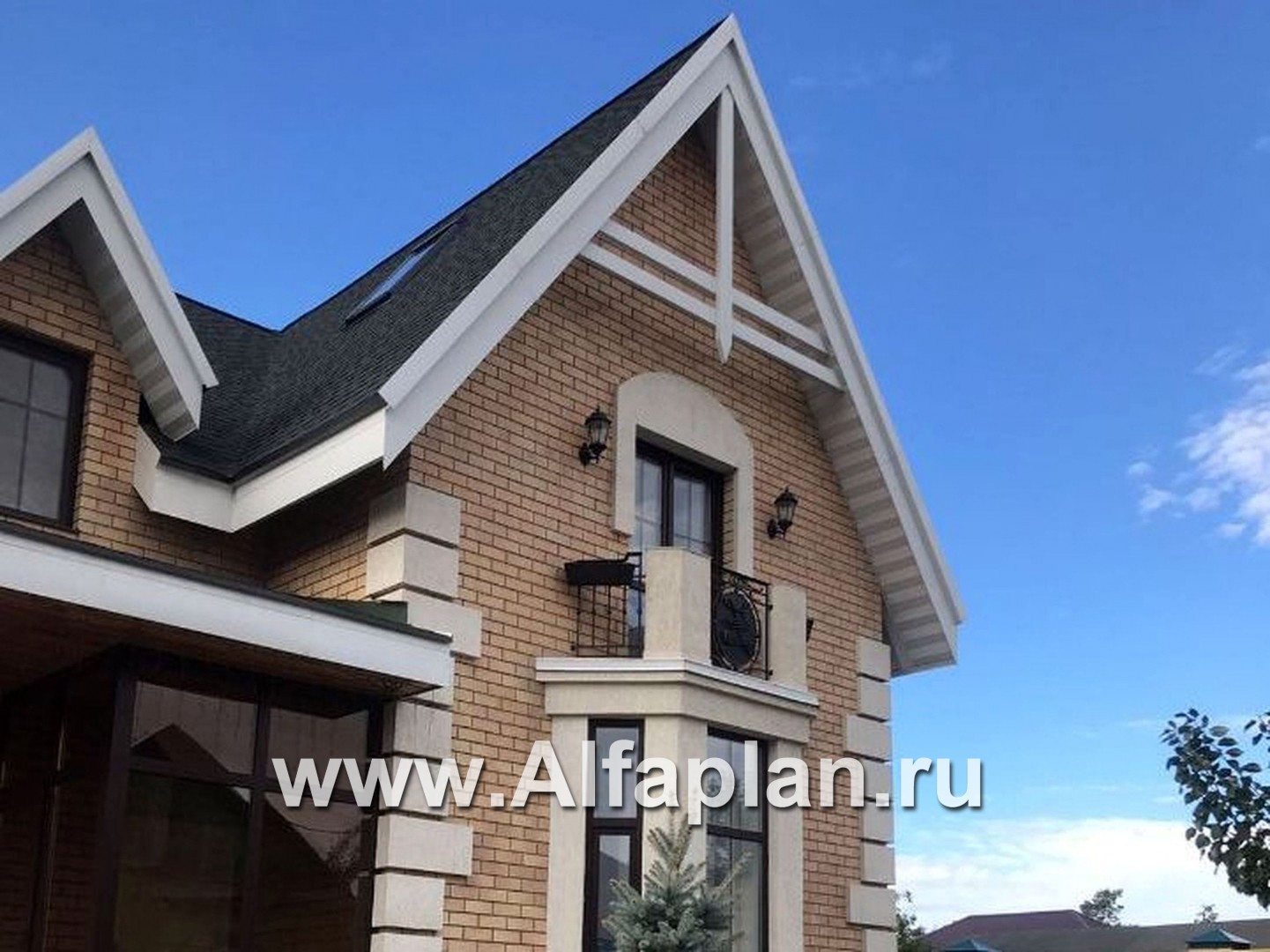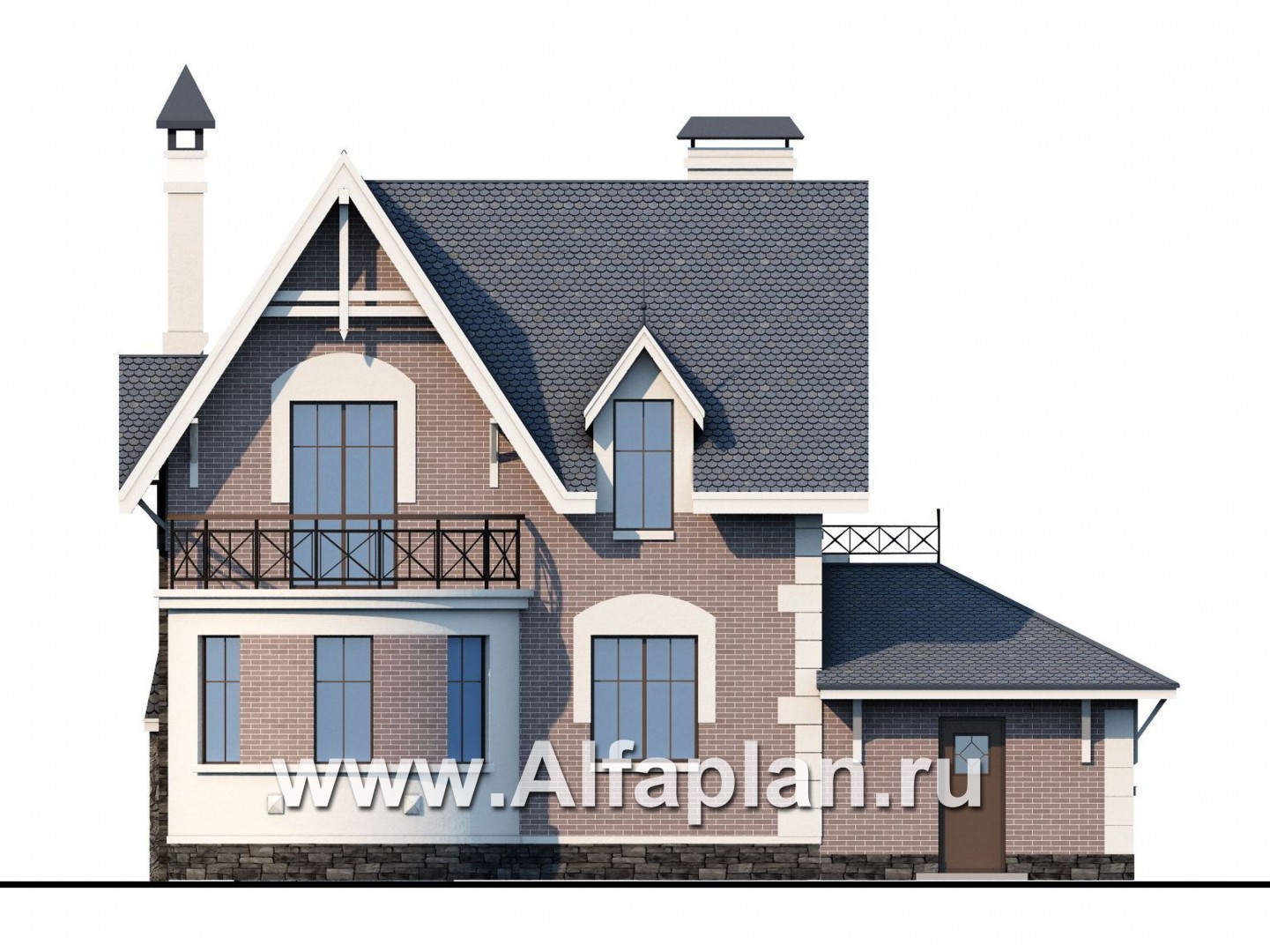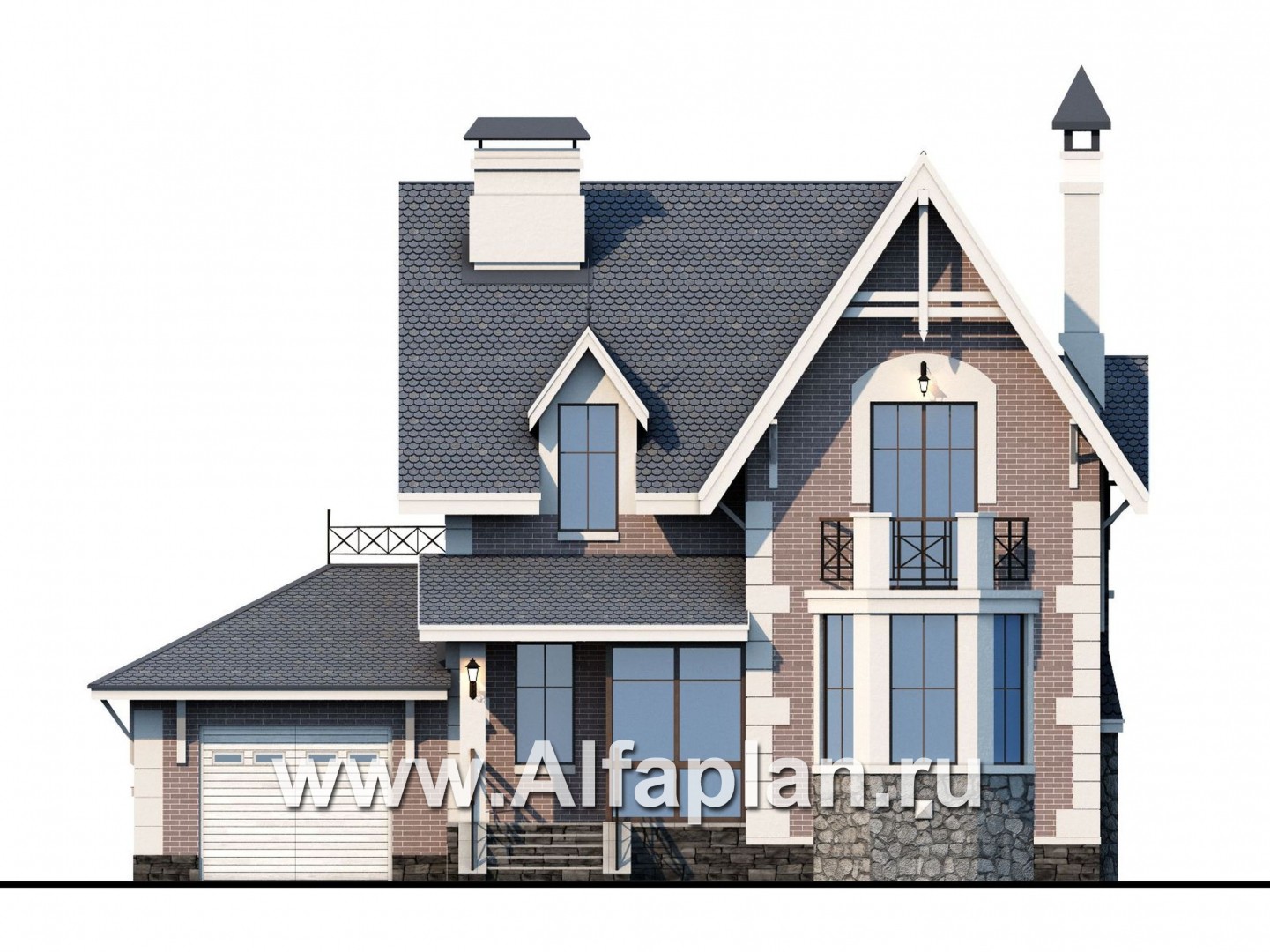- Снаружи дом отделывается штукатуркой или лицевым кирпичом на выбор заказчика, а зона цоколя декорируется облицовочным камнем.