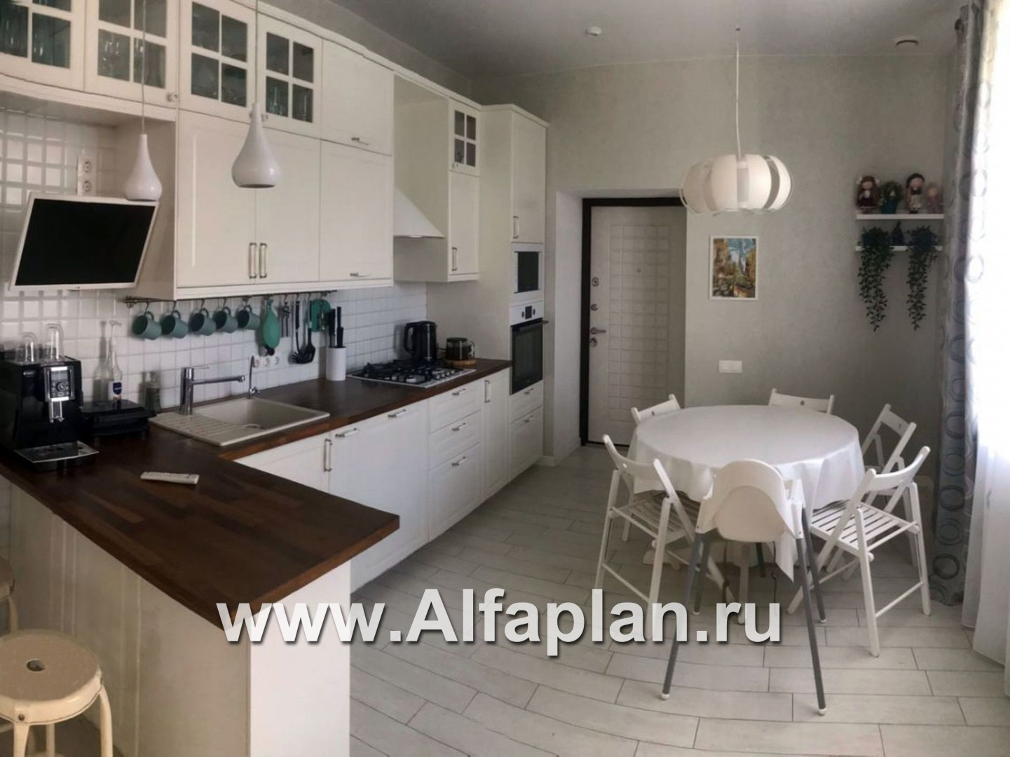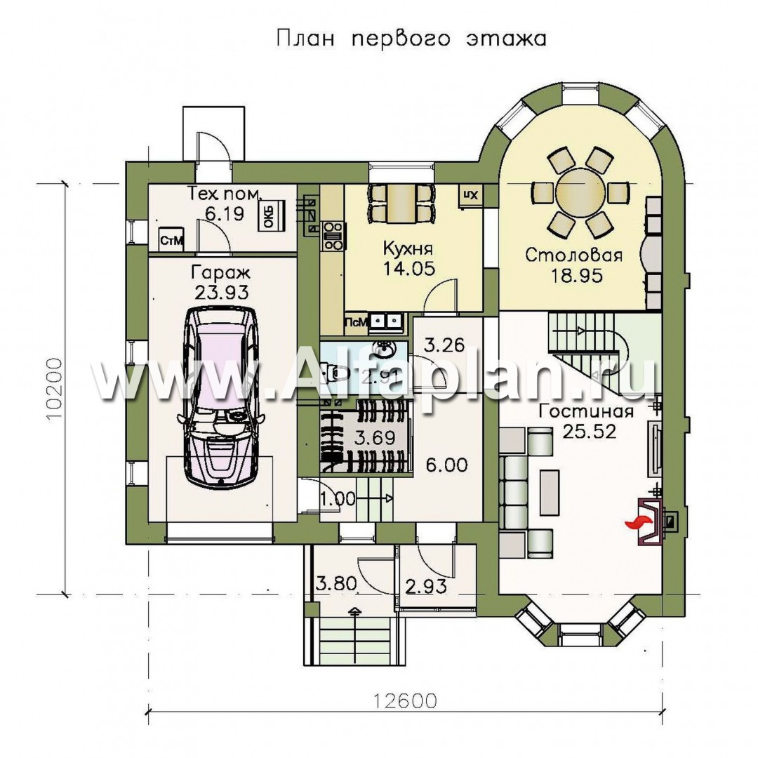Заходя в дом через небольшой тамбур, которому предшествует изящное крыльцо с лестницей, попадаем в уютный холл общей площадью 6 м2. Здесь же есть компактный гардероб, а чуть дальше — санузел. Направо ведёт лестница в гараж, из которого можно попасть в техническое помещение. Идем прямо по коридору, поворачиваем налево — мы в просторной гостиной, соединенной со столовой и кухней.