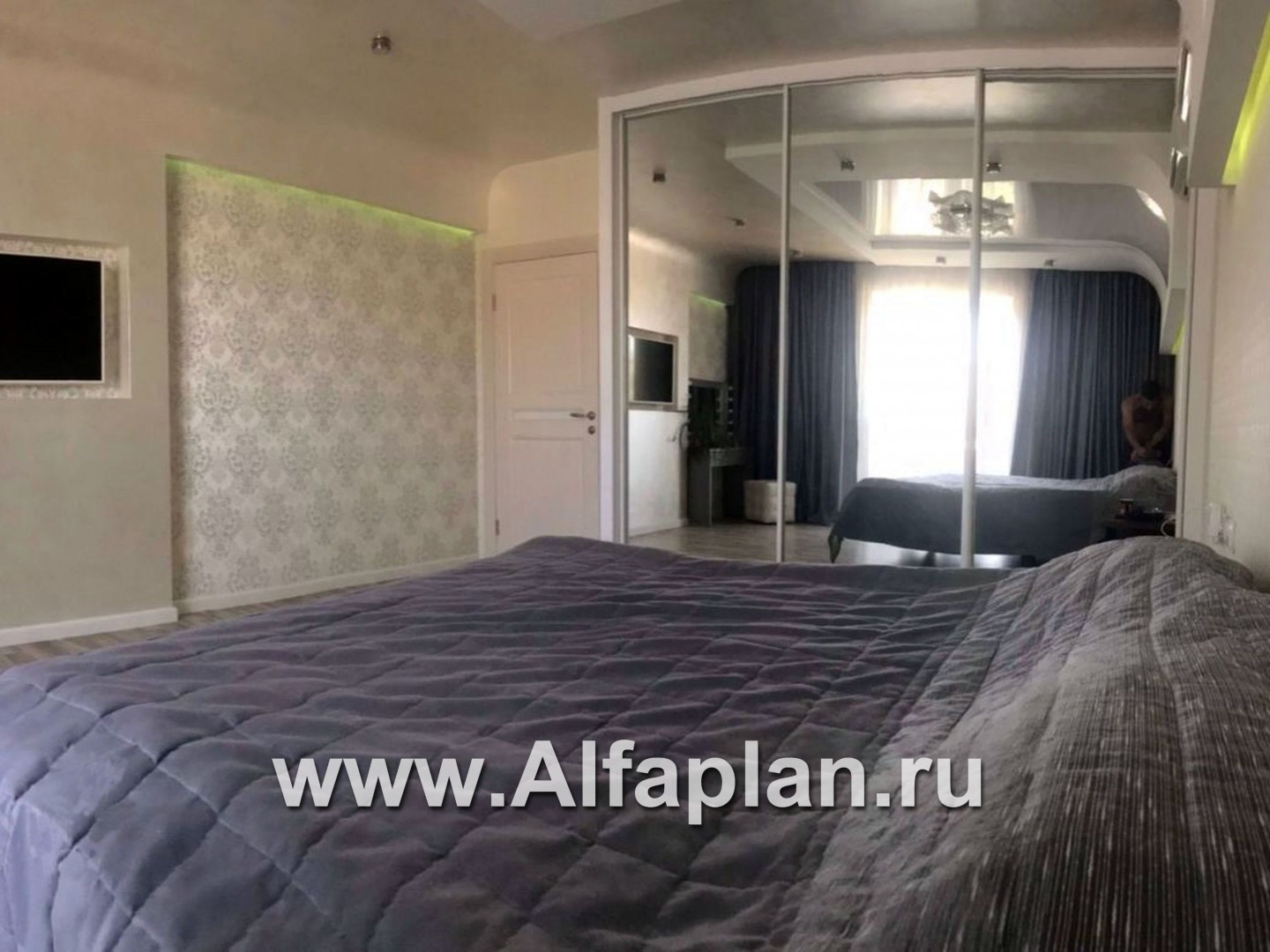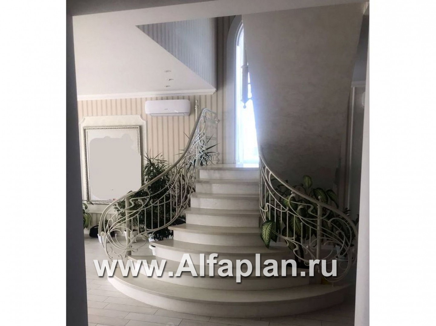 По лестнице попадаем на второй этаж — и вот? вы в холле, откуда можно пройти в одну из 3 спален или в компактный кабинет площадью 12 м2. Из кабинета есть выход на полукруглый балкон. На этом этаже также будет большая ванная комната.