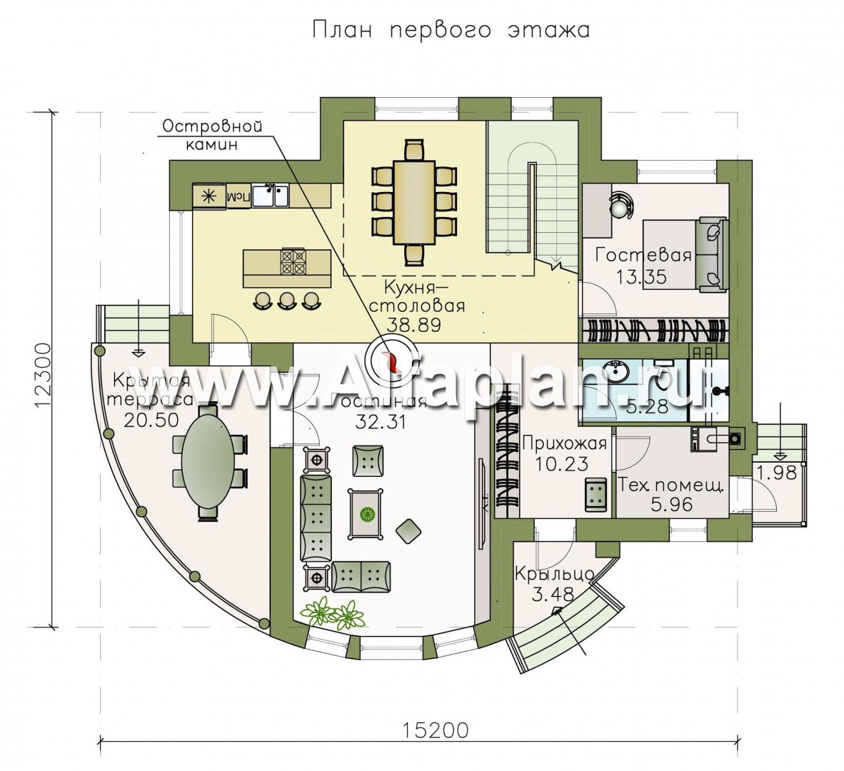 Первый этаж строения занимают комнаты общего пользования: гостиная с островным камином, огромная кухня, объединенная со столовой, гостевая комната, маленький санузел и техническое помещение.