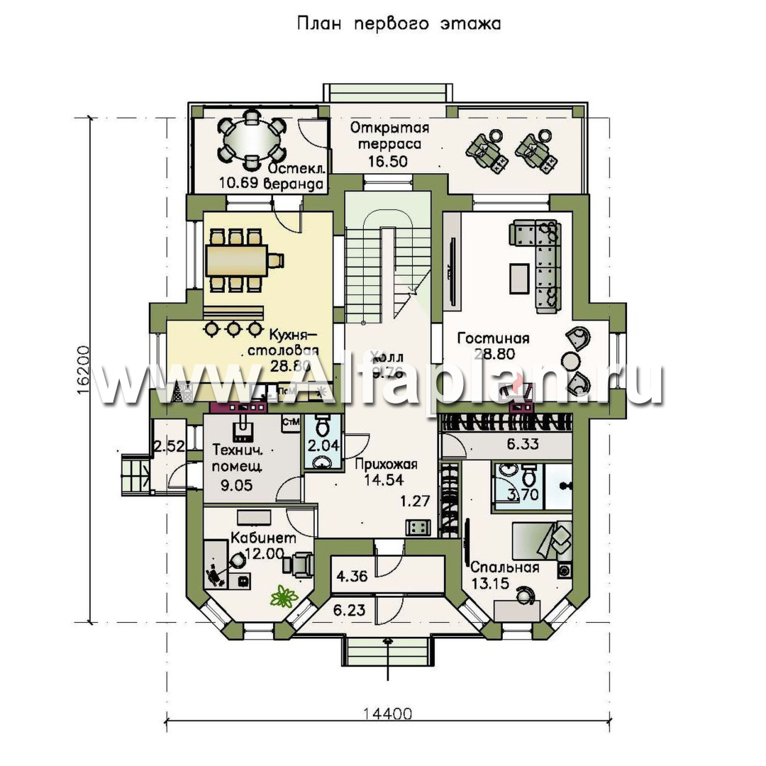 Кухня-столовая сообщается с остекленной верандой, на которой предполагается разместить дополнительную обеденную группу. С веранды можно попасть на открытую террасу, имеющую отдельный выход во двор.