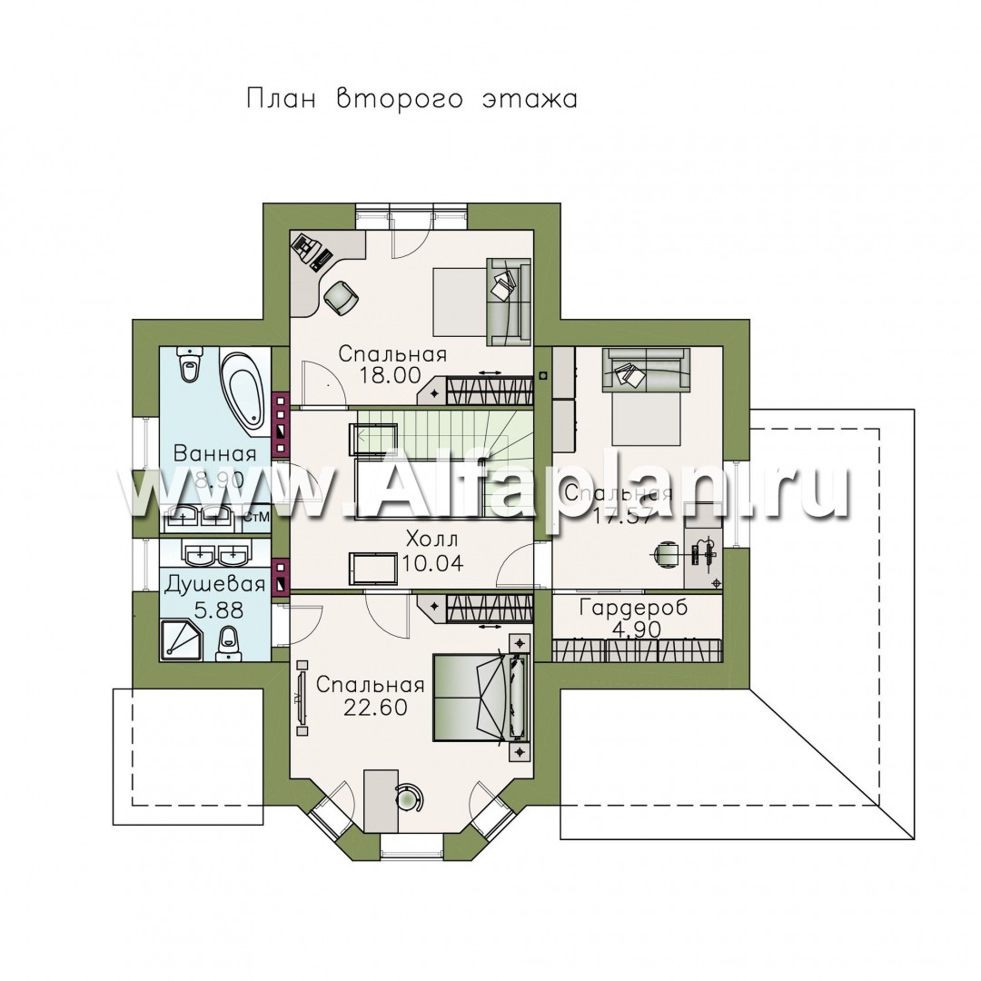 В центре второго этажа просторный холл 10 м² с лестницей, из которого можно попасть в спальные комнаты и общую ванную. Две спальни имеют площади по 18 м², в одной из них оборудован гардероб. Мастер-спальня с эркером занимает 23 м² и имеет собственную душевую.