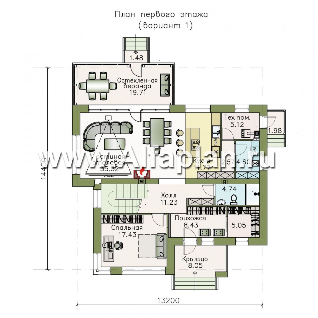 Планировка дома очень рациональна. На входе в дом – большая прихожая, с отдельным, закрытым гардеробом площадью 5м2. Из прихожей попадаешь в холл с лестницей на второй этаж, и широким проемом в гостиную. Гостиная-столовая-кухня – одно помещение, с панорамным остеклением и выходом на прилегающую террасу. Позади кухни находятся постирочная и техническое помещение. На первом этаже есть также кабинет (гостевая) 17м2. Есть вариант планировки первого этажа с сауной.
