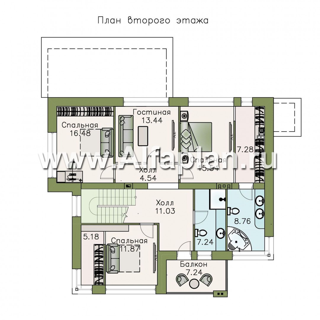 На втором этаже – спальня владельцев дома, с отдельными гардеробом и ванной комнатой (мастер-спальная). Для других жителей дома предусмотрены еще две спальни и душевая. На втором этаже есть также просторный холл, с выходом на балкон над крыльцом. При желании, часть холла может быть выгорожена в кабинет, или еще одну спальню.