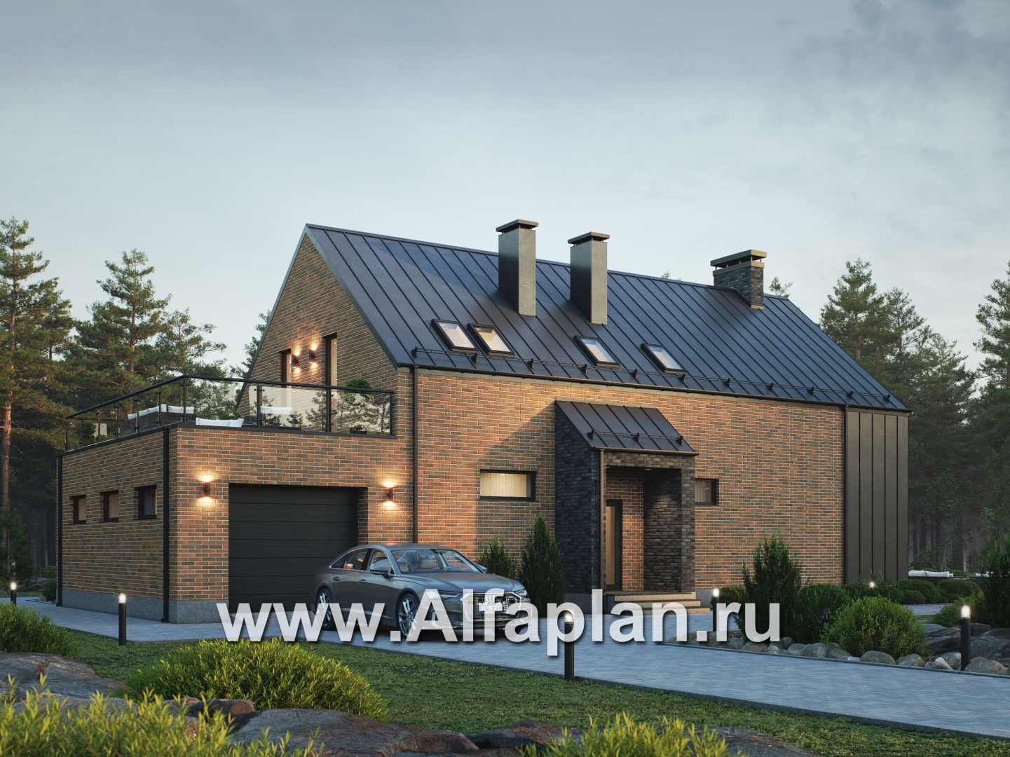 G144a Проект дома с мансардой, планировка с террасой и с гаражом, 5 спален, в стиле барнхаус