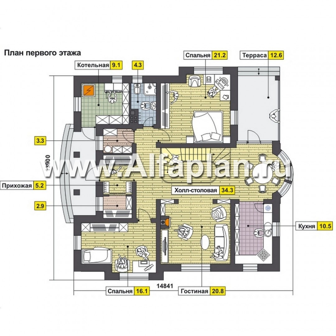 Первый этаж загородного дома снабжен всем необходимым для комфортного проживания. В левом крыле располагается котельная. Рядом находится спальная комната, имеющая выход на террасу. Вторая спальня спроектирована в правой части коттеджа и соседствует с просторной гостиной. Место для отдыха и приема гостей соединено с холлом-столовой, что является практичным архитектурным решением. Приготовить любимые блюда можно в кухне, которая имеет достаточные для этого размеры.